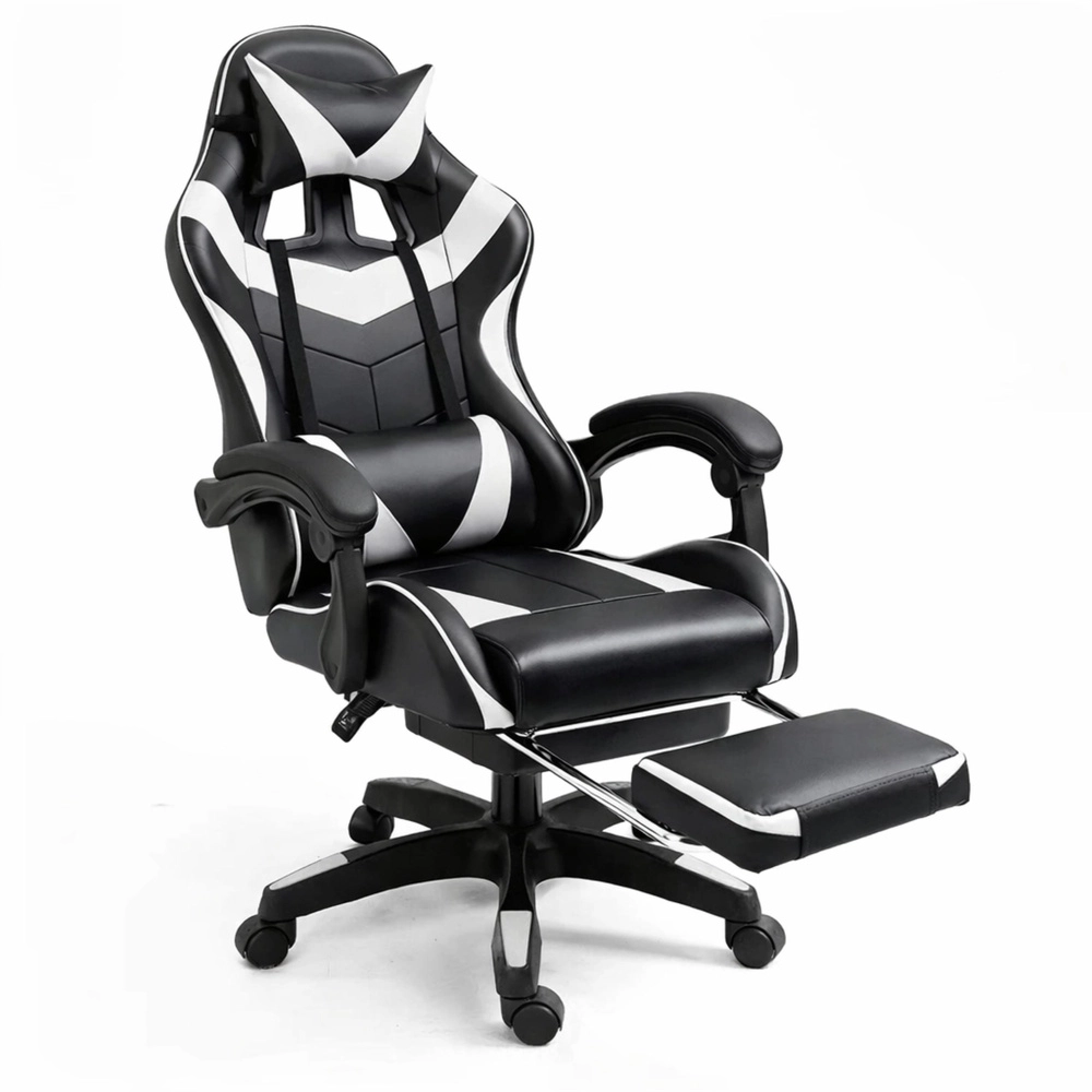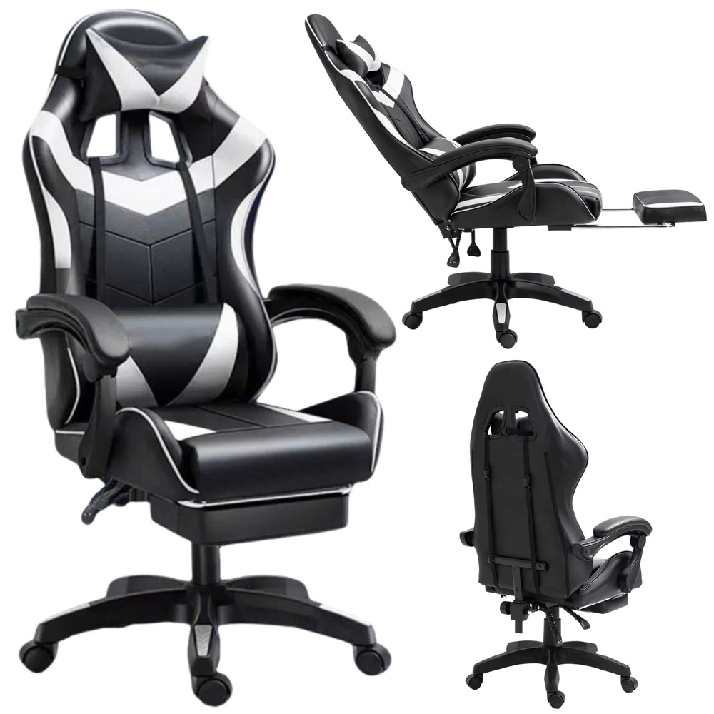 Gaming stol z nastavljivo višino, nagibnim naslonjalom, naslonom za noge in ergonomskim dizajnom za udobno dolgotrajno uporabo doma ali v pisarni.