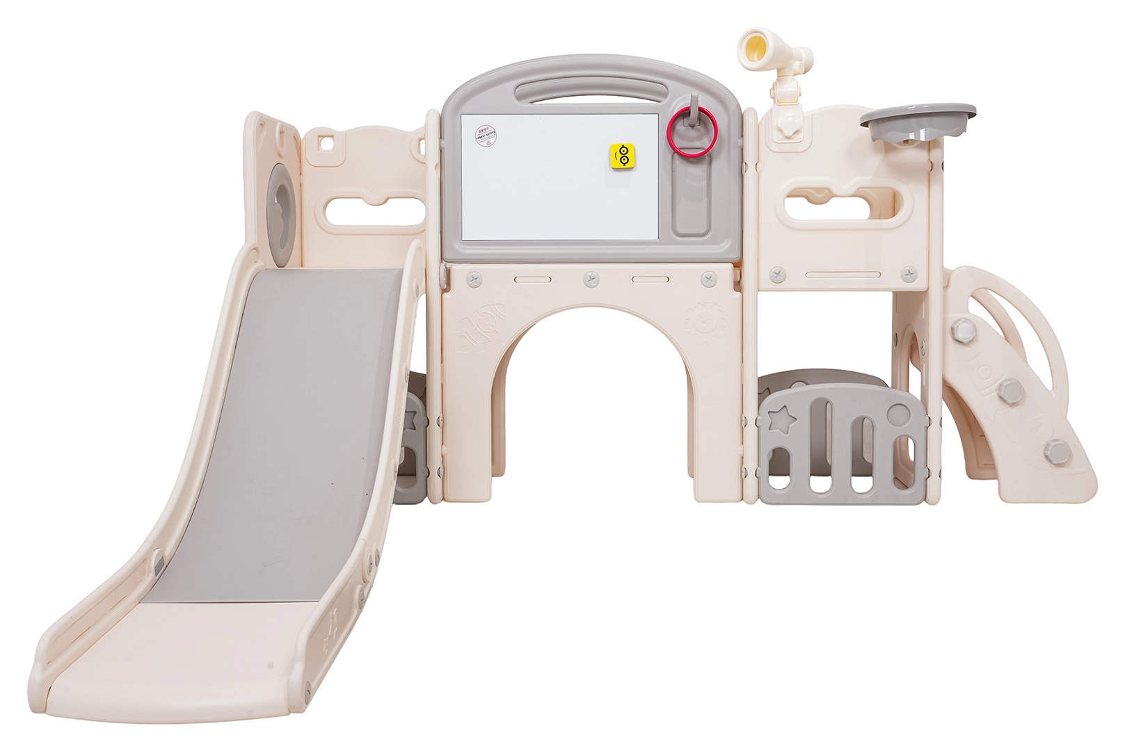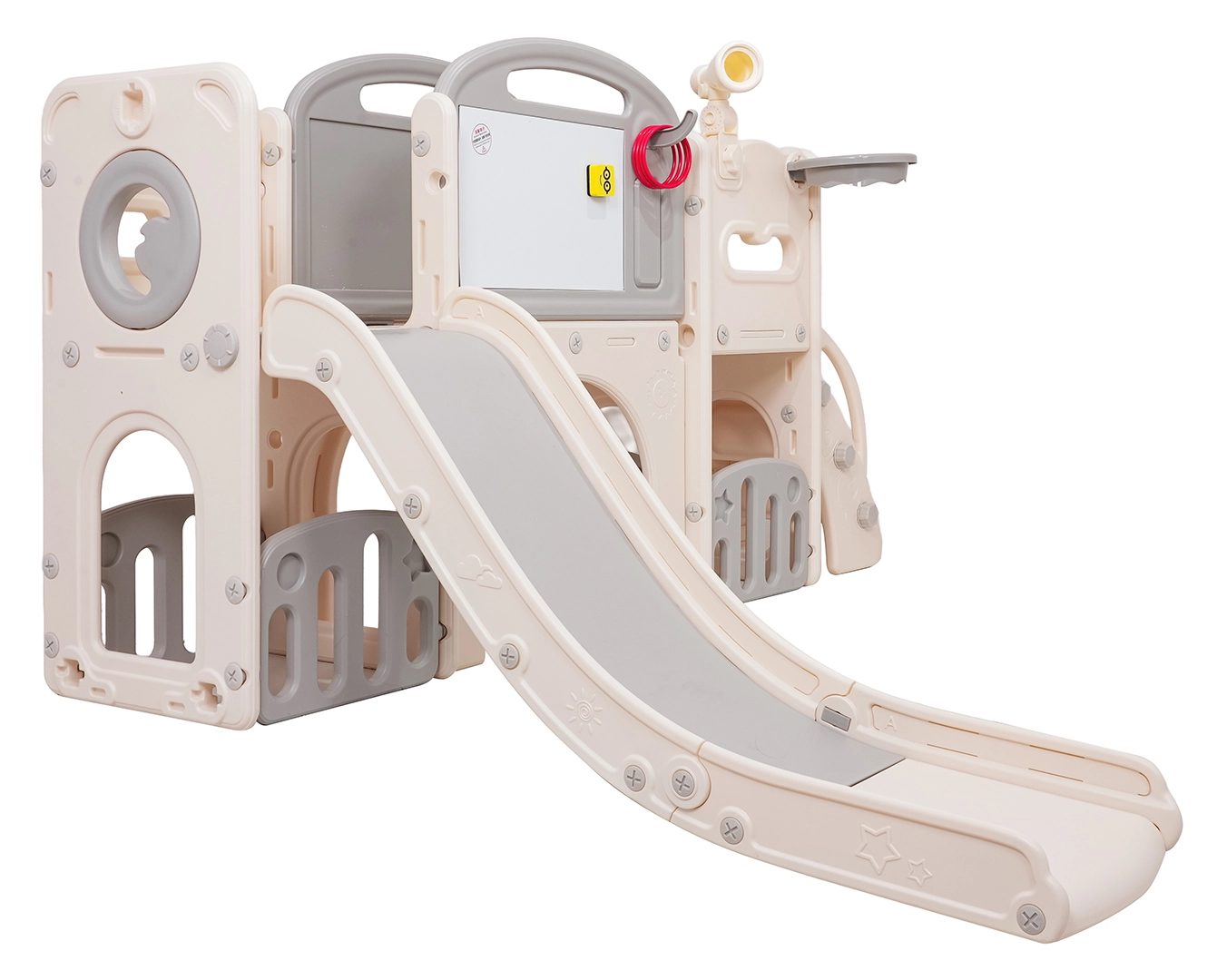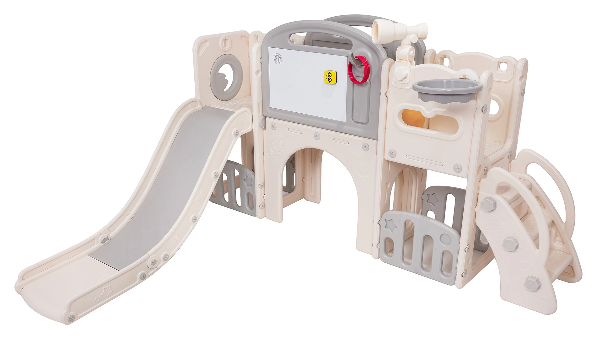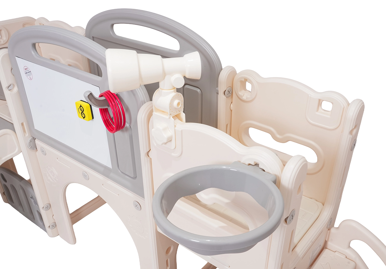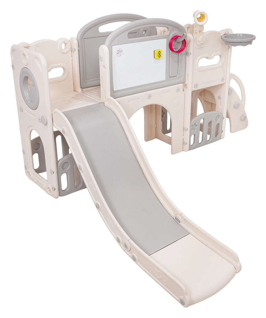 Večnamenski otroški igralni set 5v1 združuje zabavo, gibanje in učenje v enem izdelku. Vključuje tobogan, koš za košarko, tablo za risanje, igro z metanjem obročev in nogometni gol, kar omogoča raznoliko igro tako na prostem kot v notranjih prostorih.