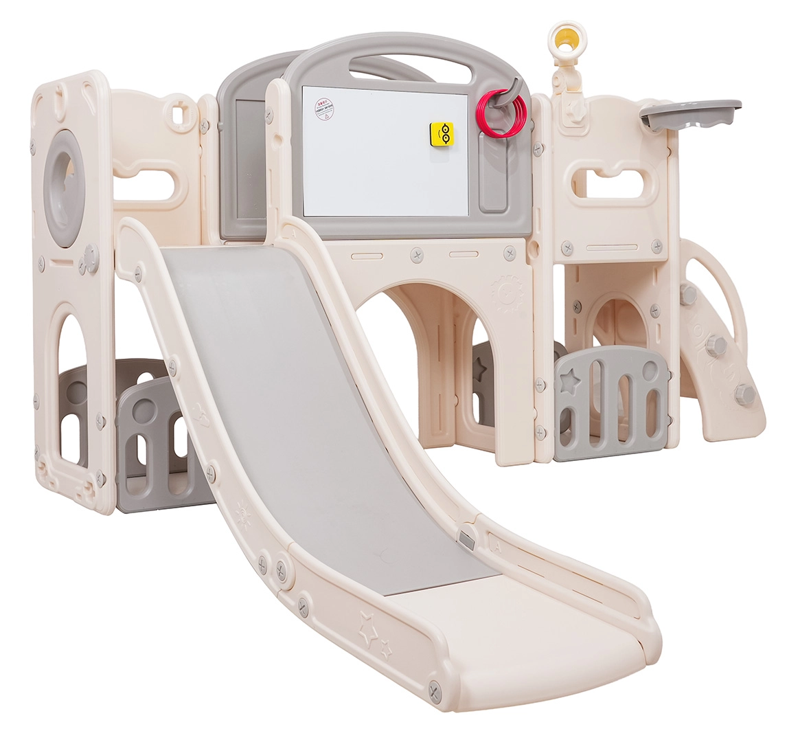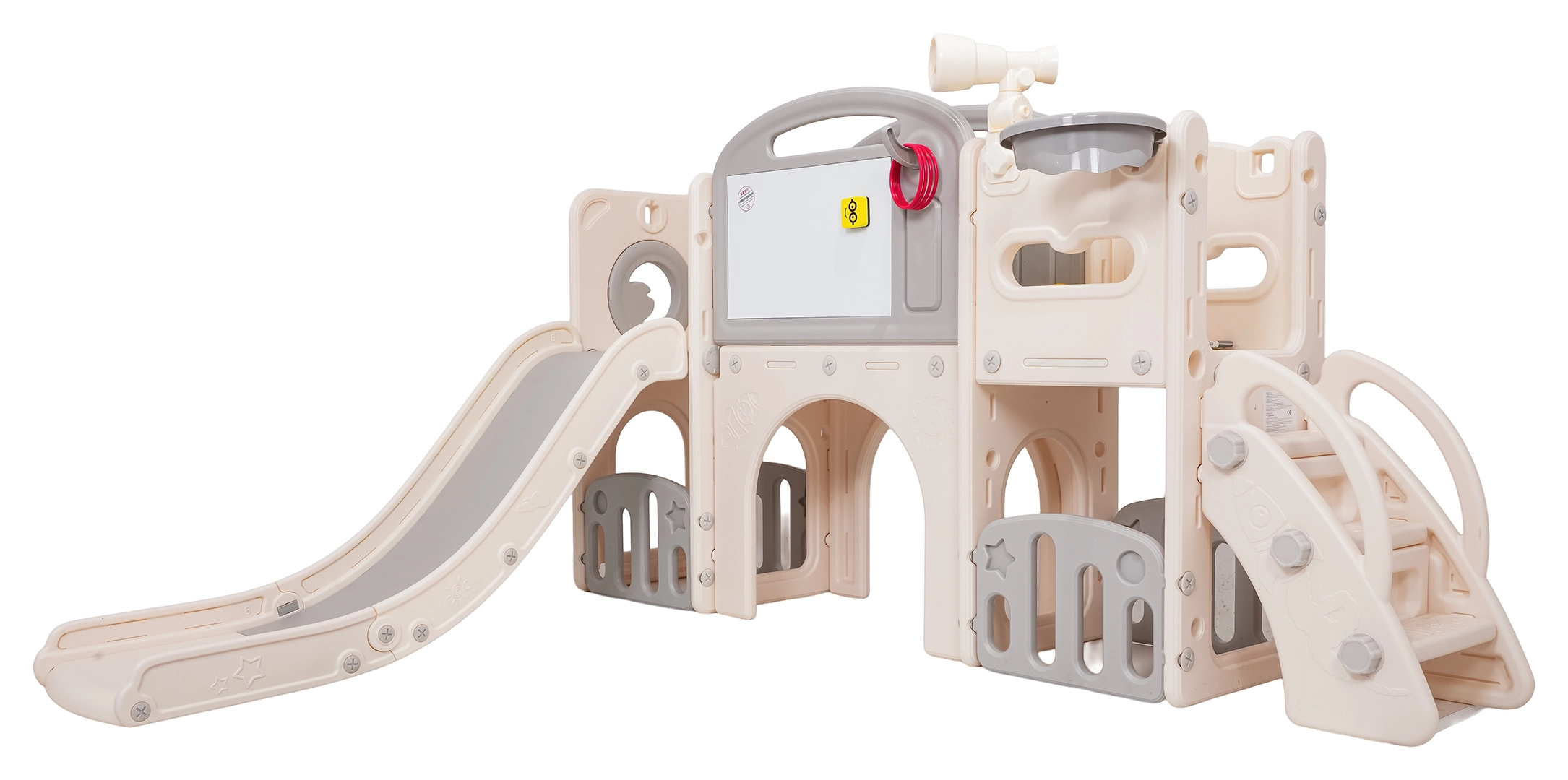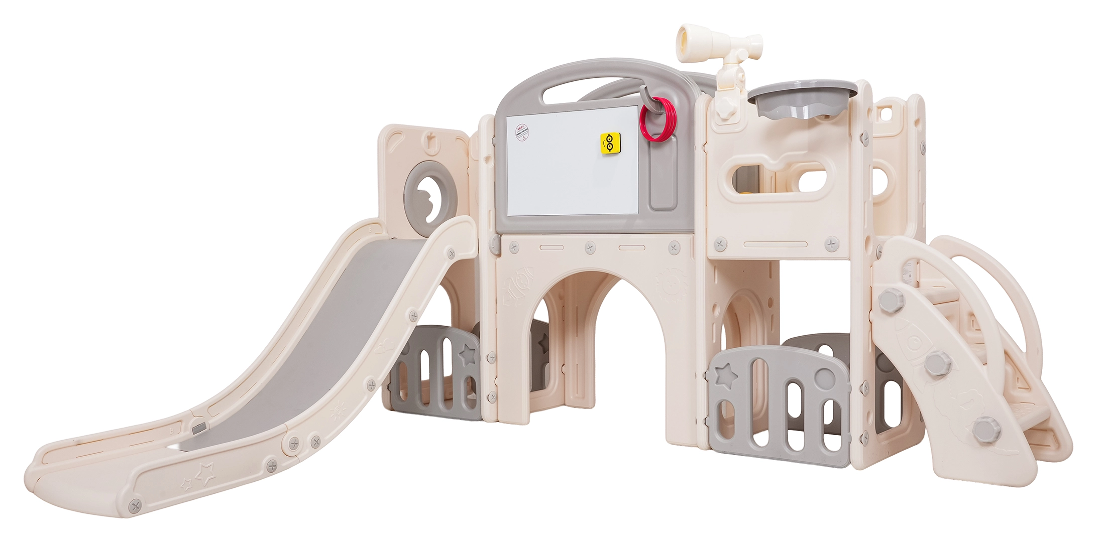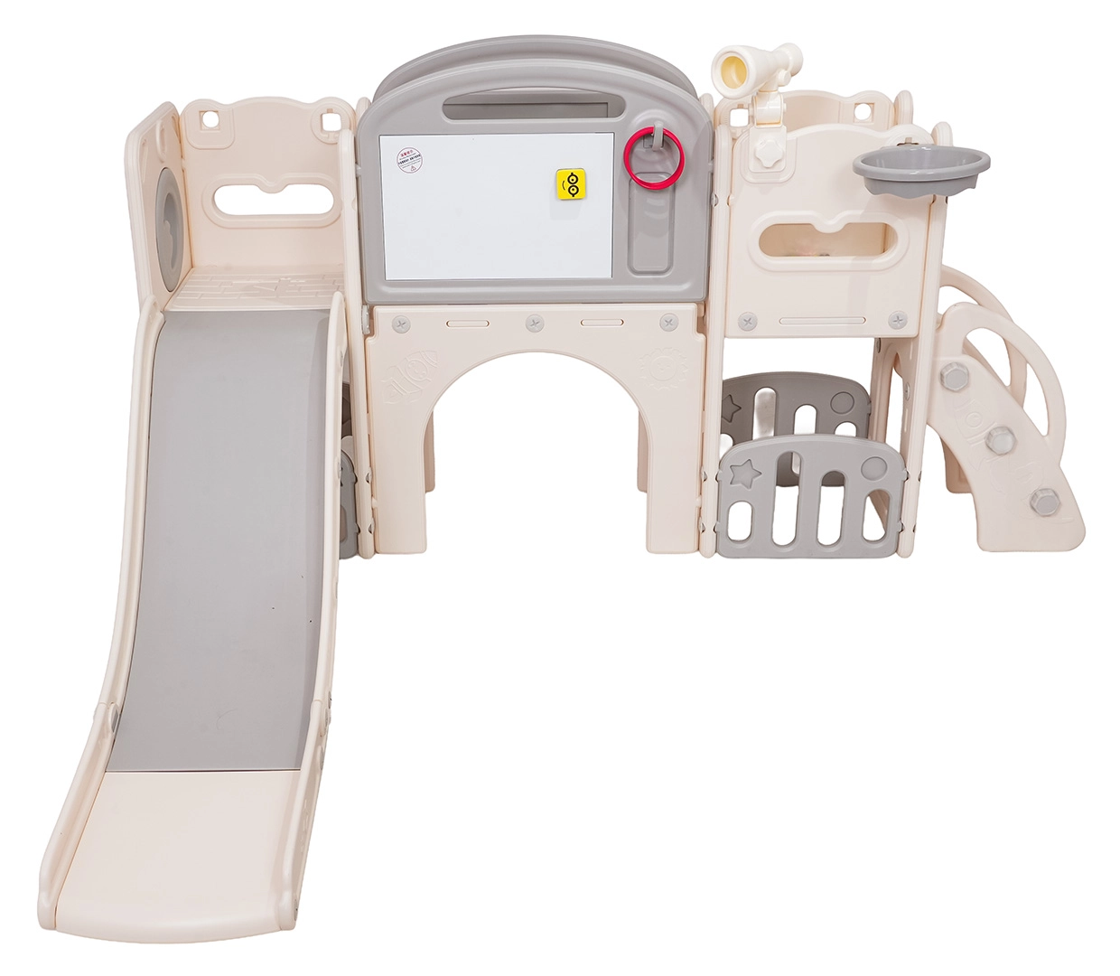Večnamenski otroški igralni set 5v1 združuje zabavo, gibanje in učenje v enem izdelku. Vključuje tobogan, koš za košarko, tablo za risanje, igro z metanjem obročev in nogometni gol, kar omogoča raznoliko igro tako na prostem kot v notranjih prostorih.