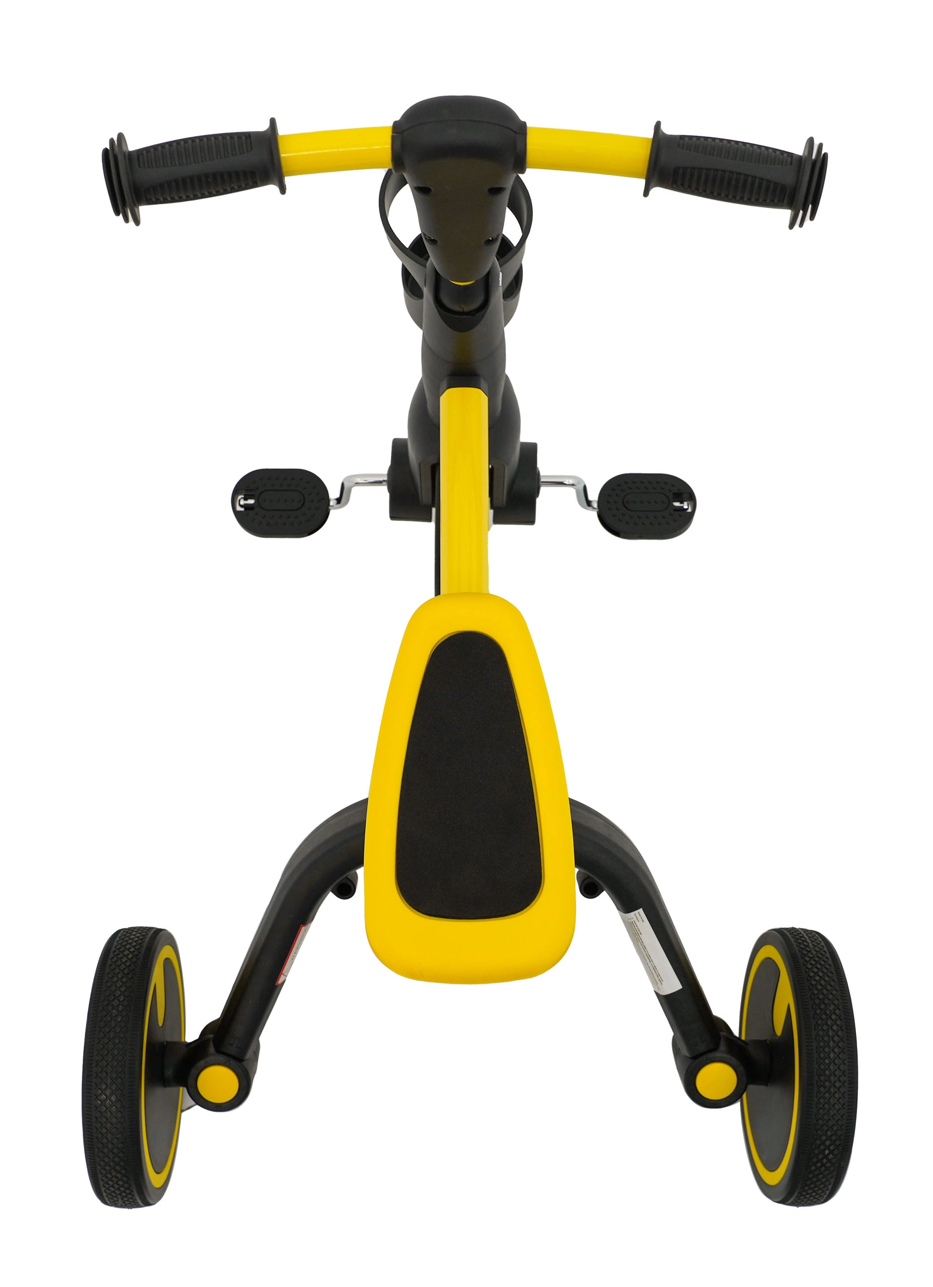 Pedala je mogoče enostavno odstraniti, zato se tricikel hitro spremeni v poganjalec. Udoben sedež, oblazinjen s peno, je nastavljiv po višini v dveh stopnjah, gumirani ročaji na krmilu pa zagotavljajo dober in varen oprijem. Dodaten držalo za napitek povečuje praktičnost pri vsakodnevni uporabi.